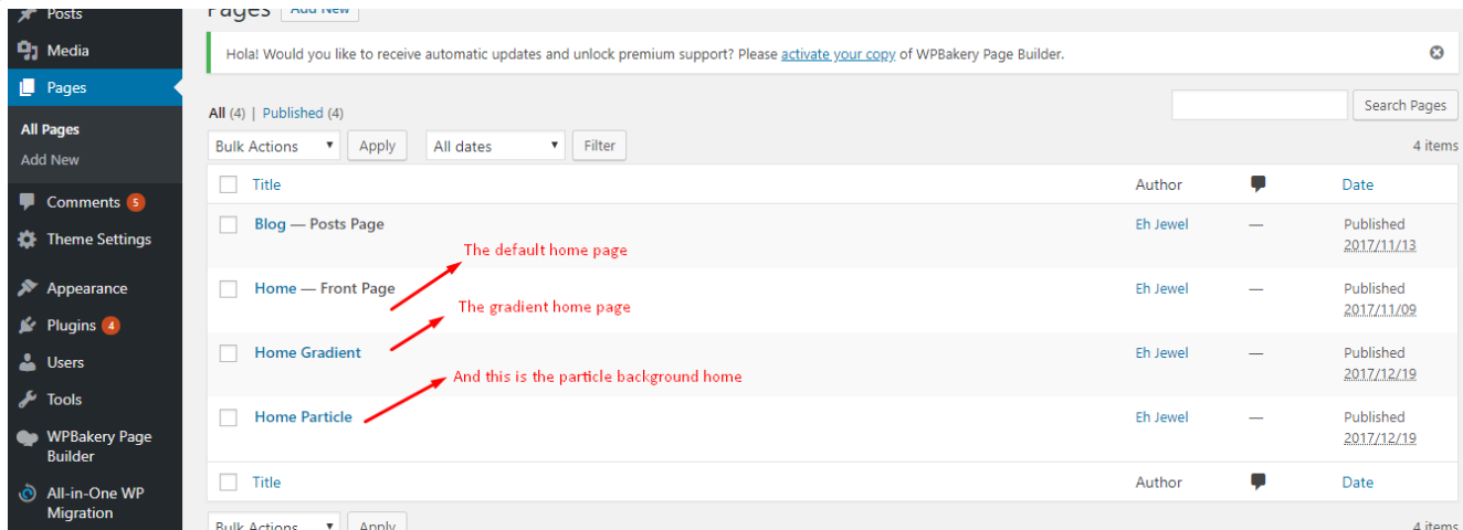 Every demo has 3 pages including the  Default homepage, Gradient homepage, and the Particle background homepage. Navigate to Pages from your WordPress dashboard menu to see all pages. Take a look the below screenshot-